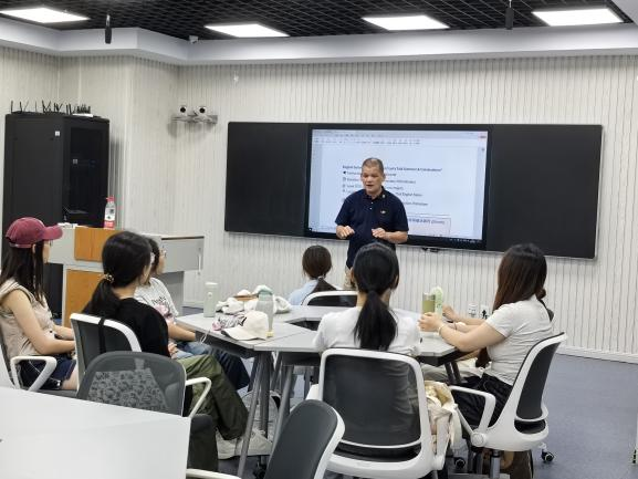 交流环节,Dr. Daniel Wicomb 以自身暑假经历为切入点,用鲜活生动的故事带动现场氛围。同学们纷纷用英语分享暑期点滴,既有英语夏令营的学习心得,也有志愿服务的深刻感悟,在轻松的交流节奏中,师生互动频繁,热情十足。