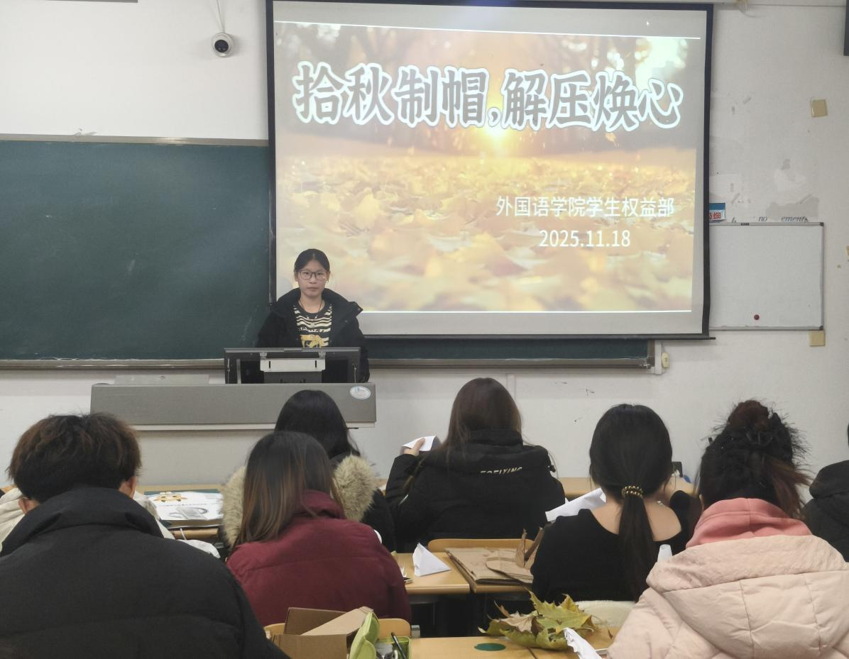 为丰富心理健康教育形式,在自然之美中发现创作乐趣,培养创新思维与审美能力,11月18日外国语学院于博文楼举办了以“秋叶寄情”为主题的心理团辅活动,将自然美学与心理疏导相结合。