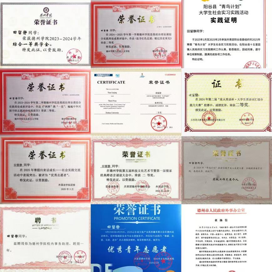 她积极投身社会实践与志愿服务,累计服务时长超过200小时。她多次参与“青鸟计划”暑期社会实践、暑期“三下乡”社会实践等活动,将所学知识运用到实际中,为乡村振兴贡献自己的一份力量,获评“青鸟计划实践工作先进个人”等荣誉。2025年4月,她以德州学院志愿者的身份参与了2025年山东省文旅产业高质量发展大会,获评“优秀青年志愿者”,以实际行动展现了外国语学院学子的专业素养和精神风貌。