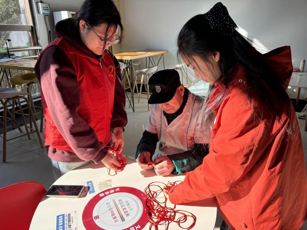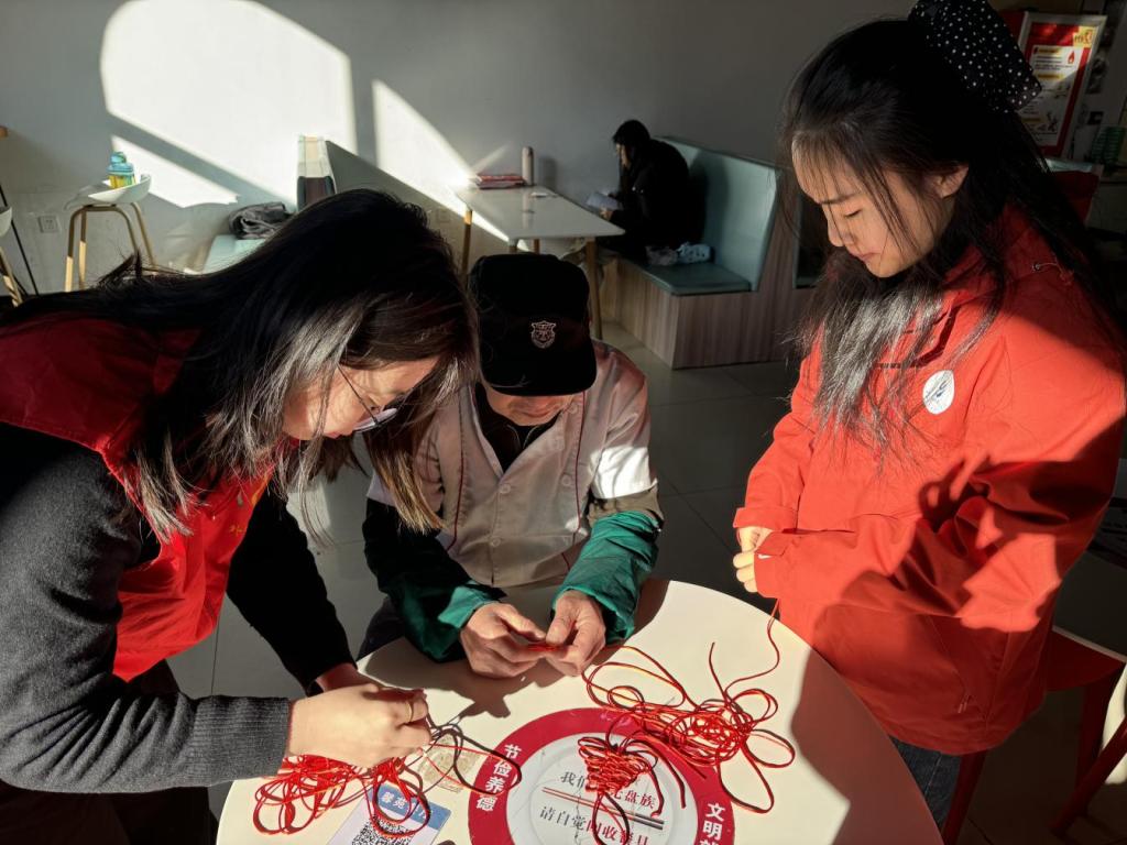 为传承中华优秀传统文化,丰富校内老年工作者的精神文化生活,12月6日,外国语学院志愿者们走进馨苑餐厅,与校内餐厅工作人员共同开展“绳结非遗,情暖银龄”中国结制作教学志愿服务活动,让非遗文化在指尖流转、温暖传递。