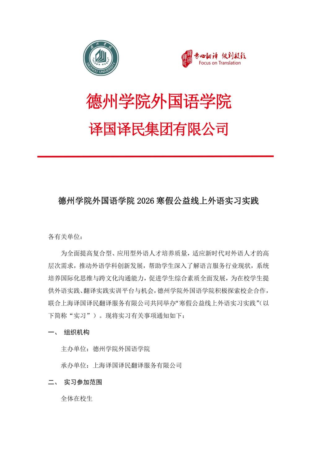 德州学院外国语学院 2026 寒假公益线上外语实习实践
