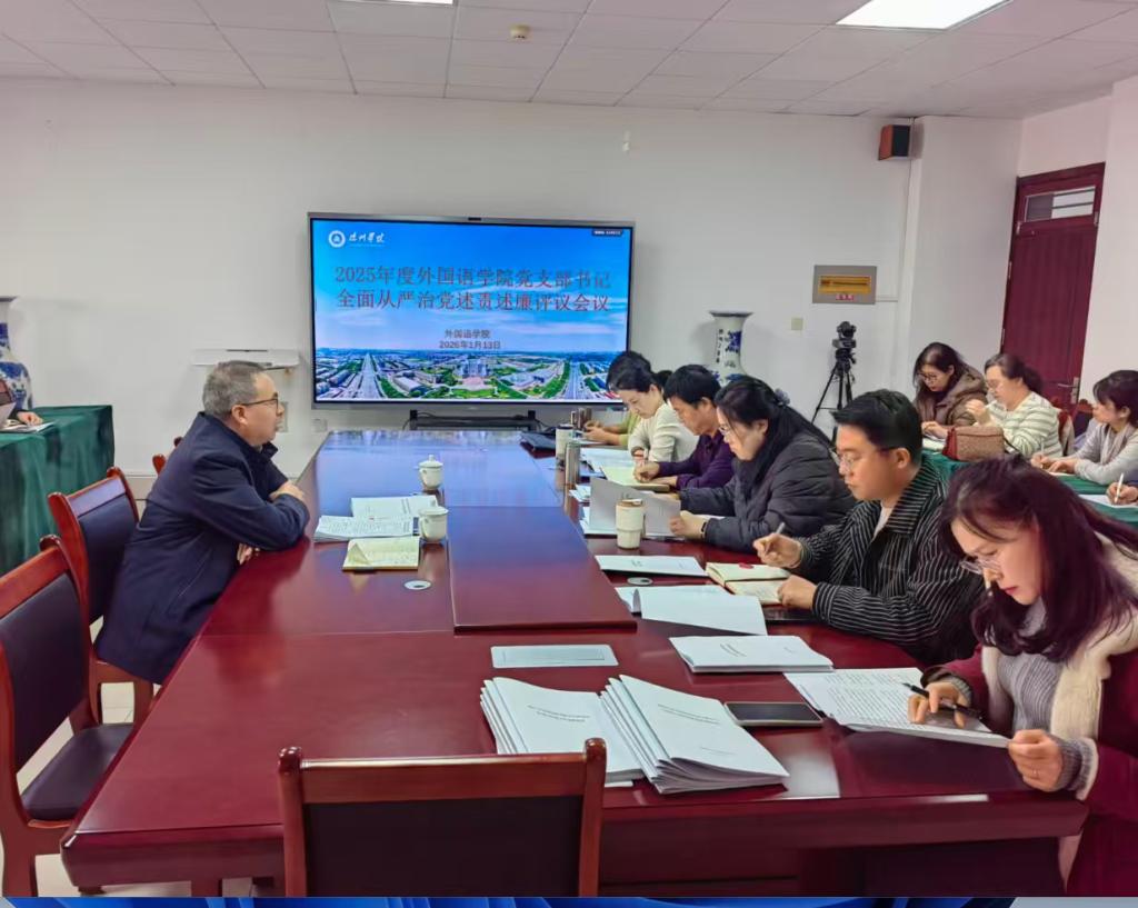 1月13日下午,外国语学院召开2025年度党支部书记全面从严治党述责述廉和抓基层党建工作述职评议工作会议。学校党委委员、副校长刘印房到会指导,学院党委班子成员、党支部书记、科级干部、党员代表参加会议。