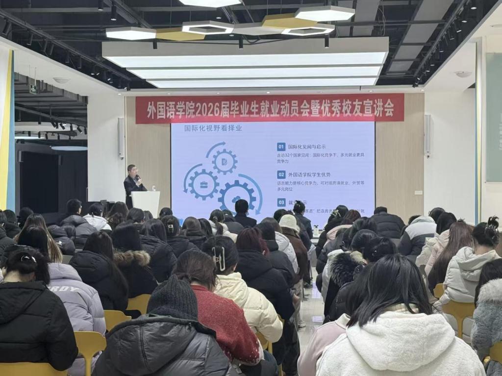 为扎实推进2026届毕业生就业工作,帮助毕业生端正就业观念、明确就业方向、提升就业竞争力,促进毕业生高质量充分就业,1月15日上午,我院在大学生创业就业赋能中心举办2026届毕业生就业动员会暨优秀校友宣讲会。外国语学院党委书记孙红旗、党委副书记董晓婷、全体辅导员及2026届毕业生参会。