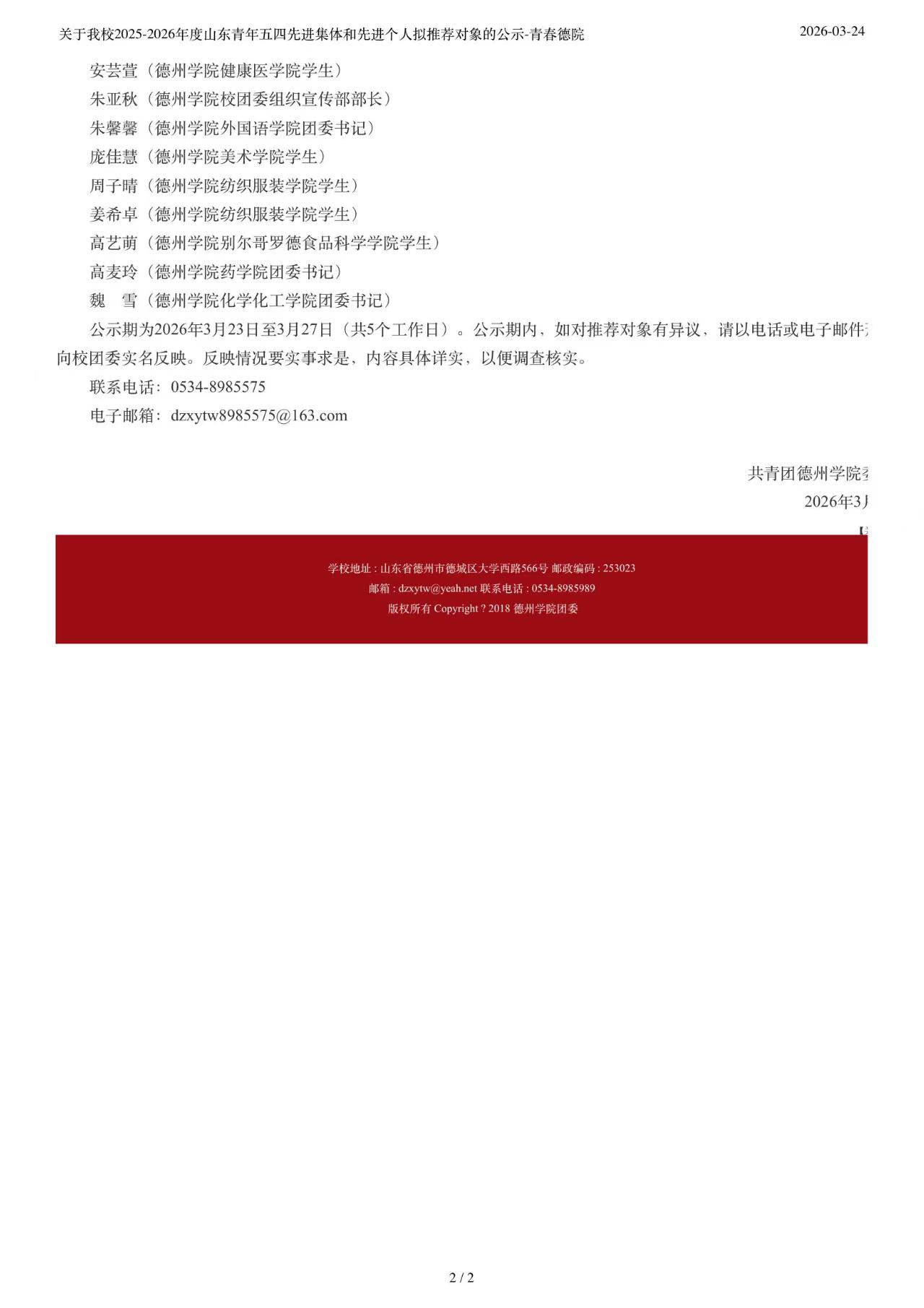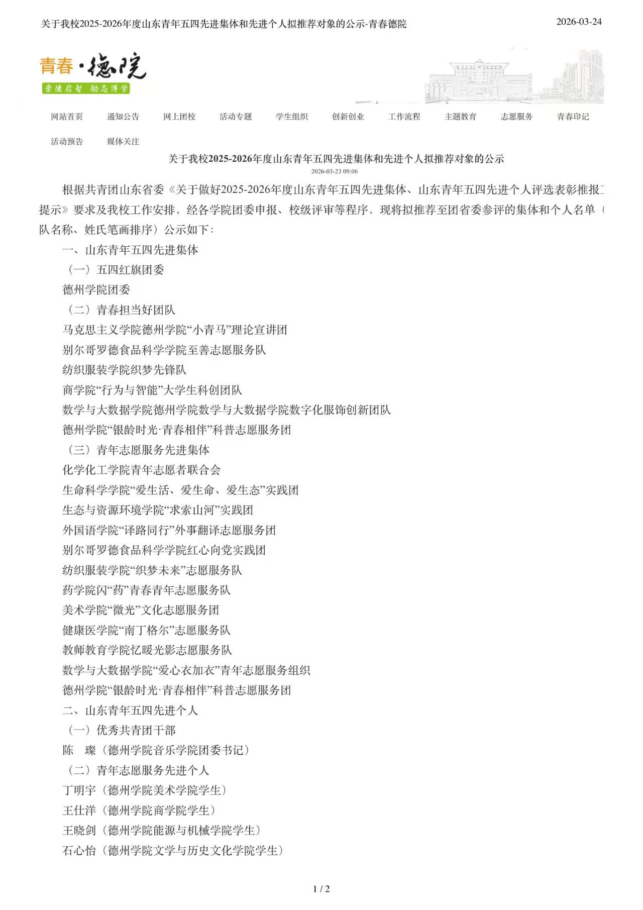 关于我校2025-2026年度⼭东青年五四先进集体和先进个⼈拟推荐对象的公⽰